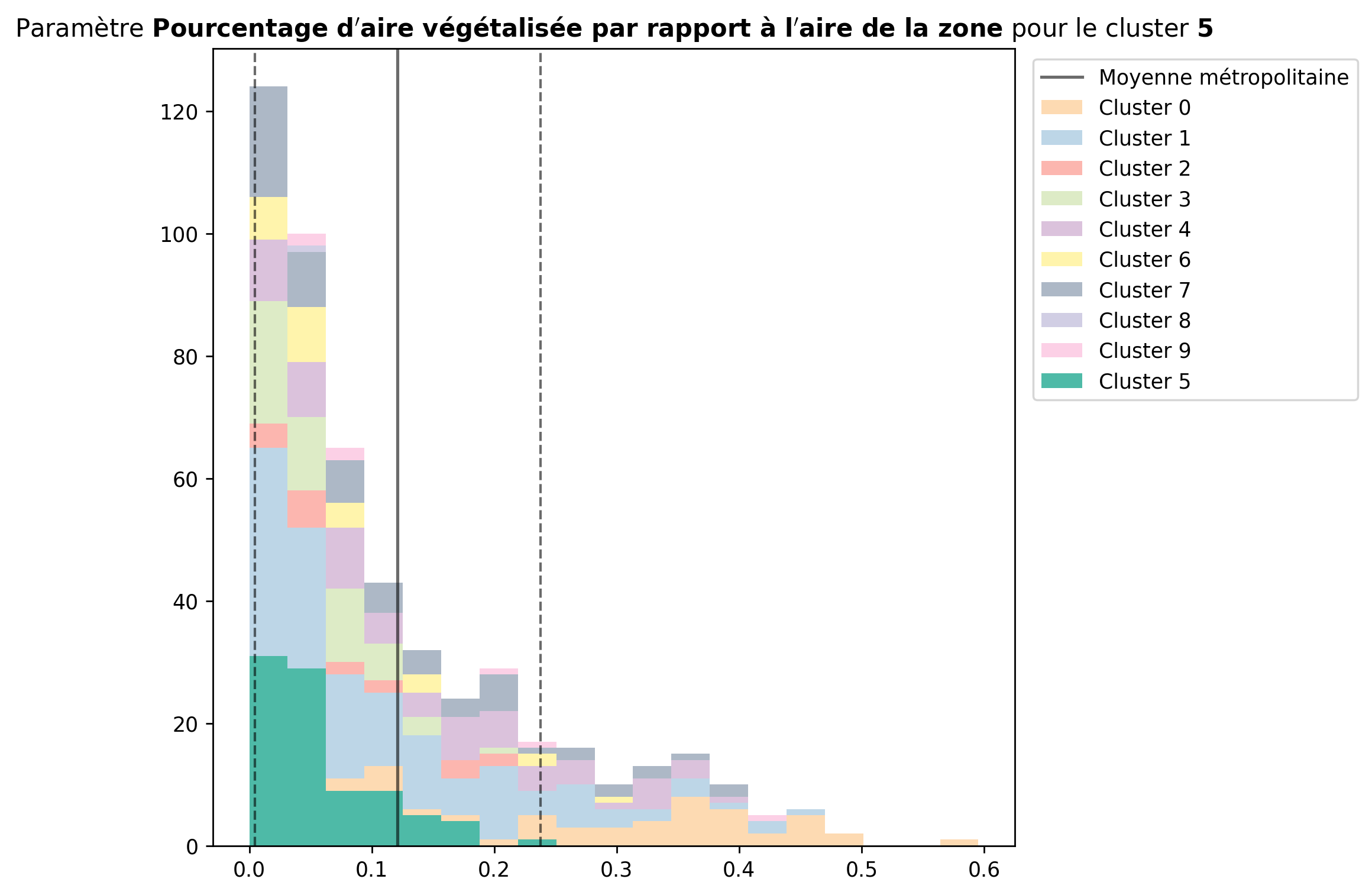 Pourcentage d’aire végétalisée par rapport à l’aire de la zone : 0.06 (+/- 0.05) contre 0.12 (+/- 0.12) pour la métropole