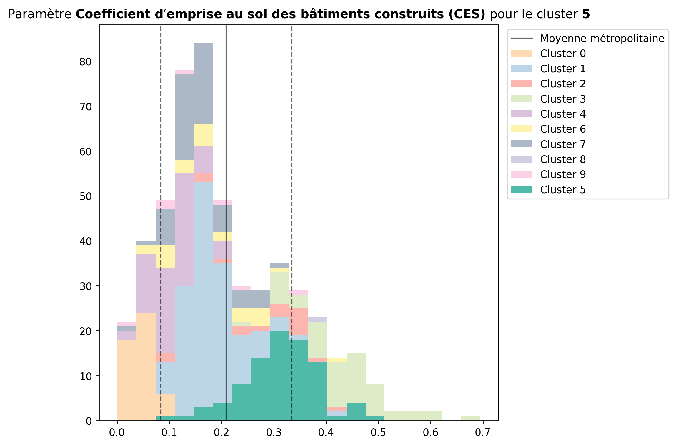 Coefficient d’emprise au sol des bâtiments construits (CES) : 0.31 (+/- 0.07) contre 0.21 (+/- 0.13) pour la métropole