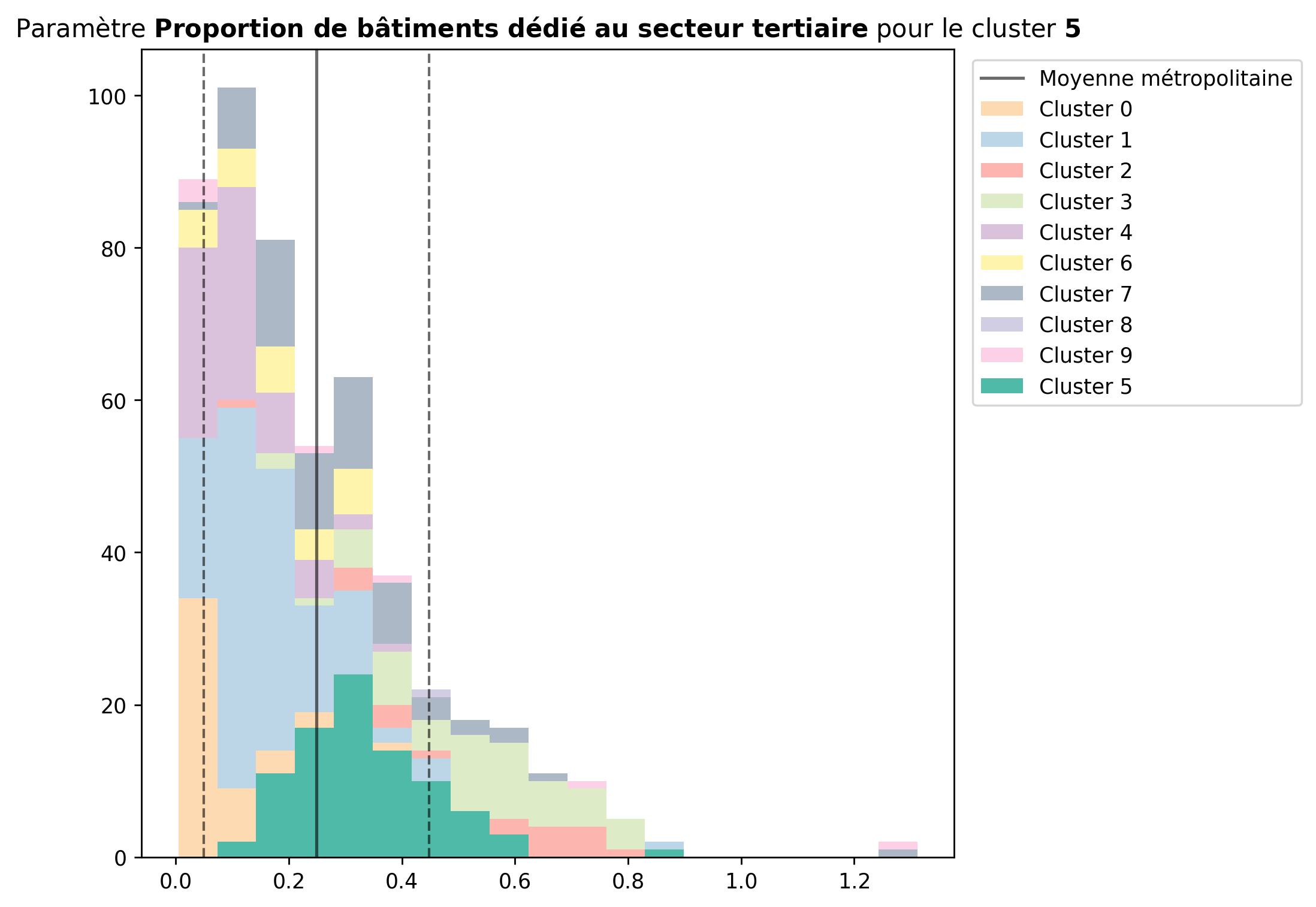 Proportion de bâtiments dédié au secteur tertiaire : 0.34 (+/- 0.13) contre 0.25 (+/- 0.20) pour la métropole